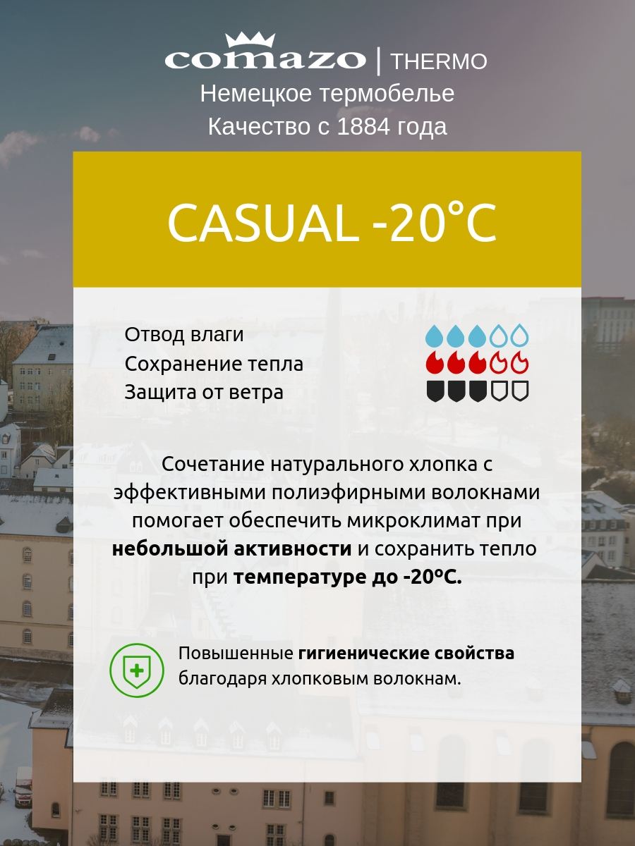 Детские термокальсоны Comazo CASUAL -20, артикул 4/11/794. Подходят для холодной и очень холодной погоды при средней физической активности. Состав: 50% хлопок, 50% полиэстер. Мягкие и плотные, сохраняют тепло, эффективно отводят влагу, обладают гигиеническими свойствами. Эластичное полотно обработано антибактериальной пропиткой. Размеры: 116, 128, 140, 152, 164-170.